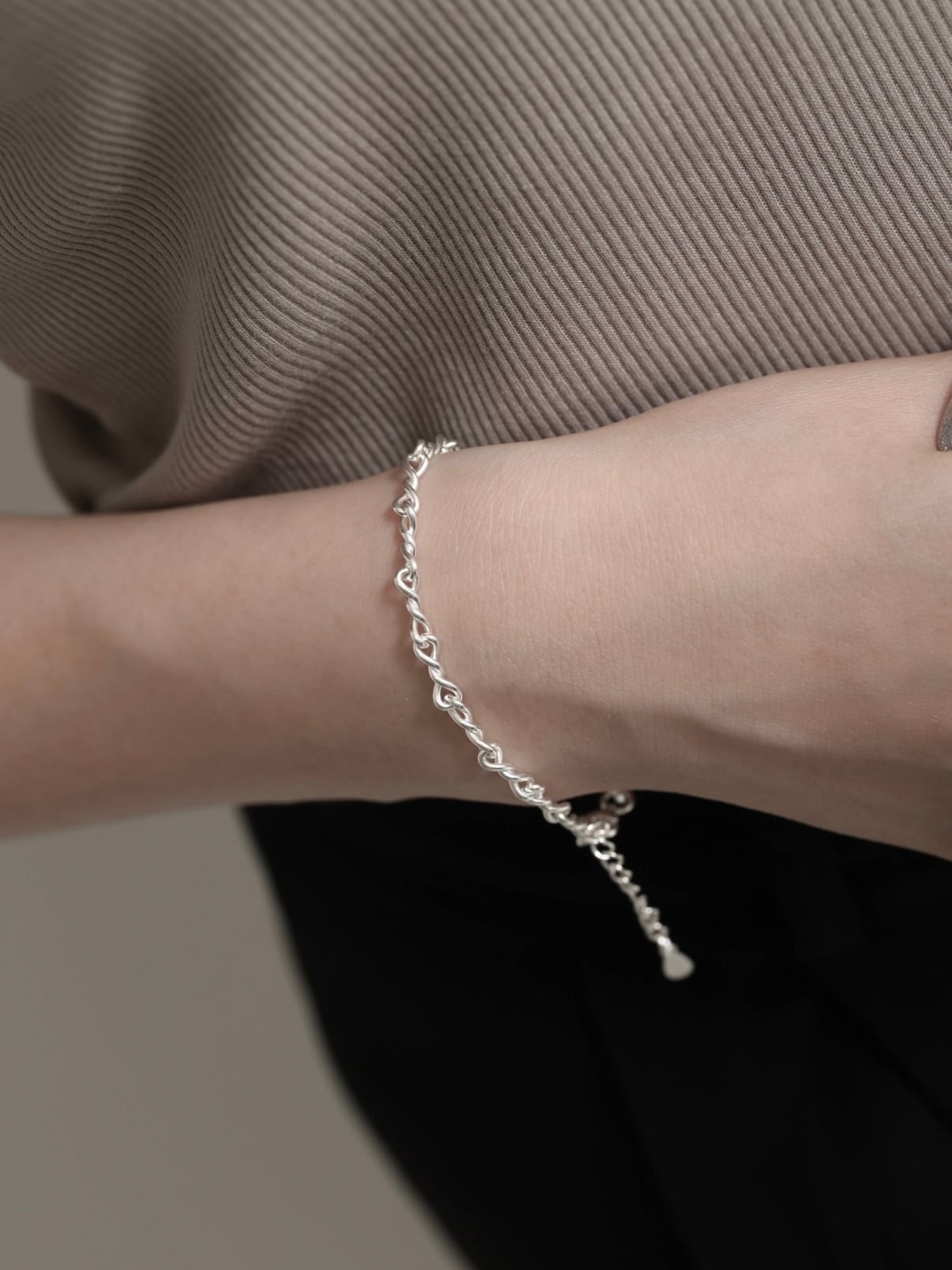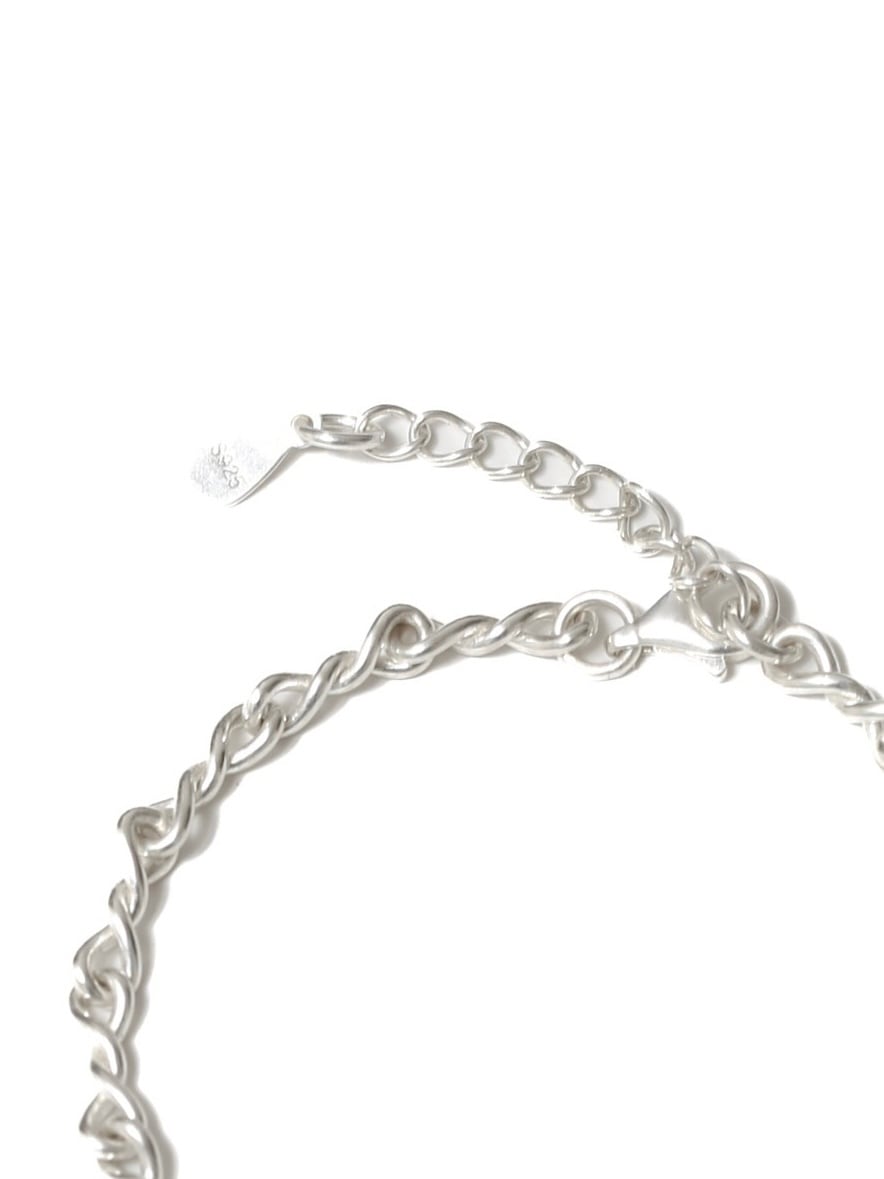 地中で絡み合う木の根をイメージしたブレスレット。撚り合わせたシルバーのラインが立体感を生み、華奢で控えめな細さがほどよく存在感を与える一本。日常に自然なニュアンスを添えるデザイン。