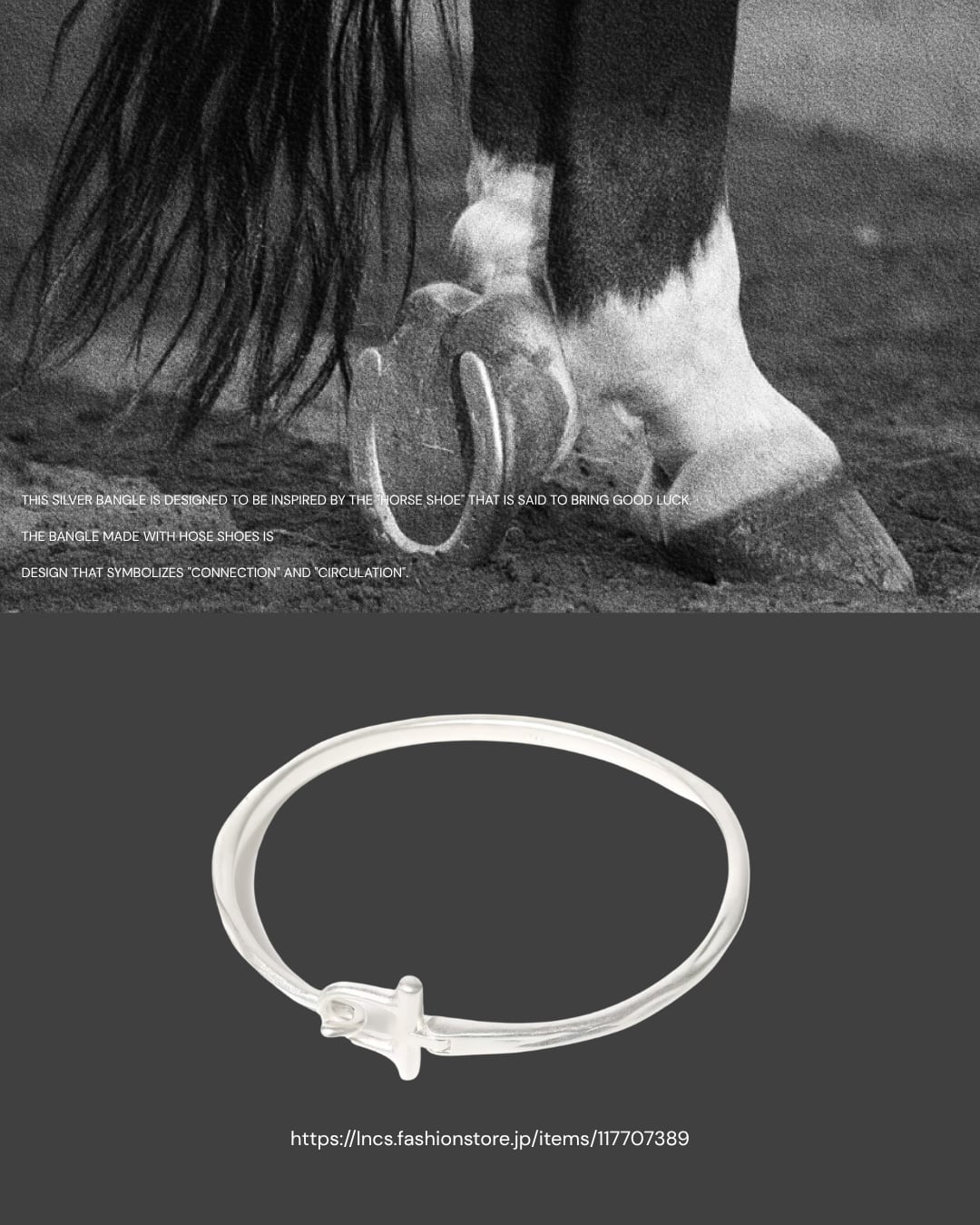 幸運を呼ぶとされる「馬蹄(ホースシュー)」からインスピレーションを受けたデザインのシルバーバングル。