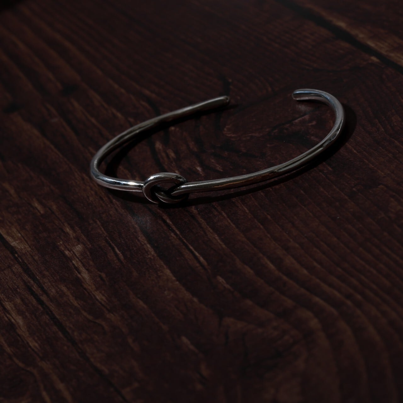 華やかなKnot(結び目)モチーフのシルバーバングル。高品質シルバーを贅沢に使用しつつも、男女共に着用できるよう、サイズを拘り、細めに制作致しました。